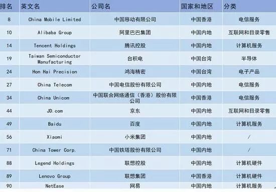 榜單顯示,有14家中國企業(yè)上榜,其中中國移動(dòng)有限公司排名最高,排名第8位,阿里巴巴集團(tuán)和騰訊控股分列第10位和第14位。