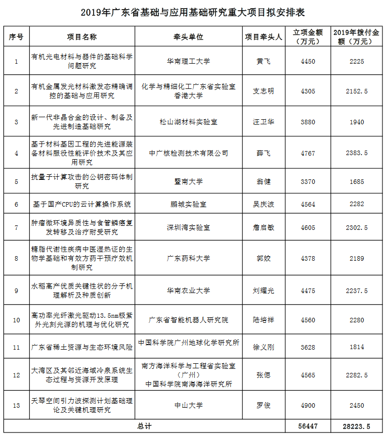 根據(jù)《廣東省省級(jí)財(cái)政專項(xiàng)資金管理辦法有關(guān)》規(guī)定,擬安排2019年度基礎(chǔ)與應(yīng)用基礎(chǔ)研究重大項(xiàng)目,本批項(xiàng)目共計(jì)13項(xiàng),擬安排財(cái)政專項(xiàng)資金28223.5萬(wàn)元,現(xiàn)予以公示。公示期自2019年10月14日~10月20日,共7天。